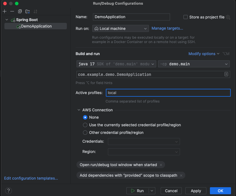 (저 사진에는 application-local.yml 을 돌리도록 설정함.)