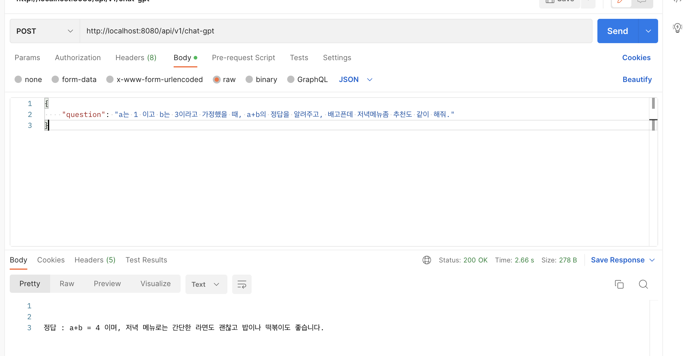 질문에 대한 응답값으로 chatgpt가 적절한 답변을 주는것을 확인 하실 수 있습니다.