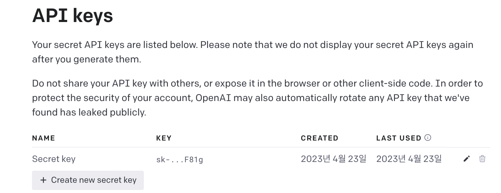 아래에 + Create new secret key 를 발급 받으실 수 있습니다.